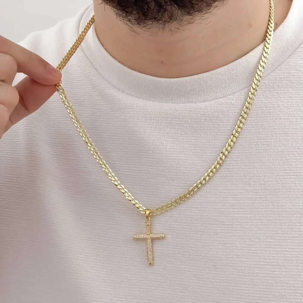 Cadena Cuaban Diamantada para Caballero de 60cm de 4mm de grosor + Cruz Clavo con micro circones cristales en Oro Laminado