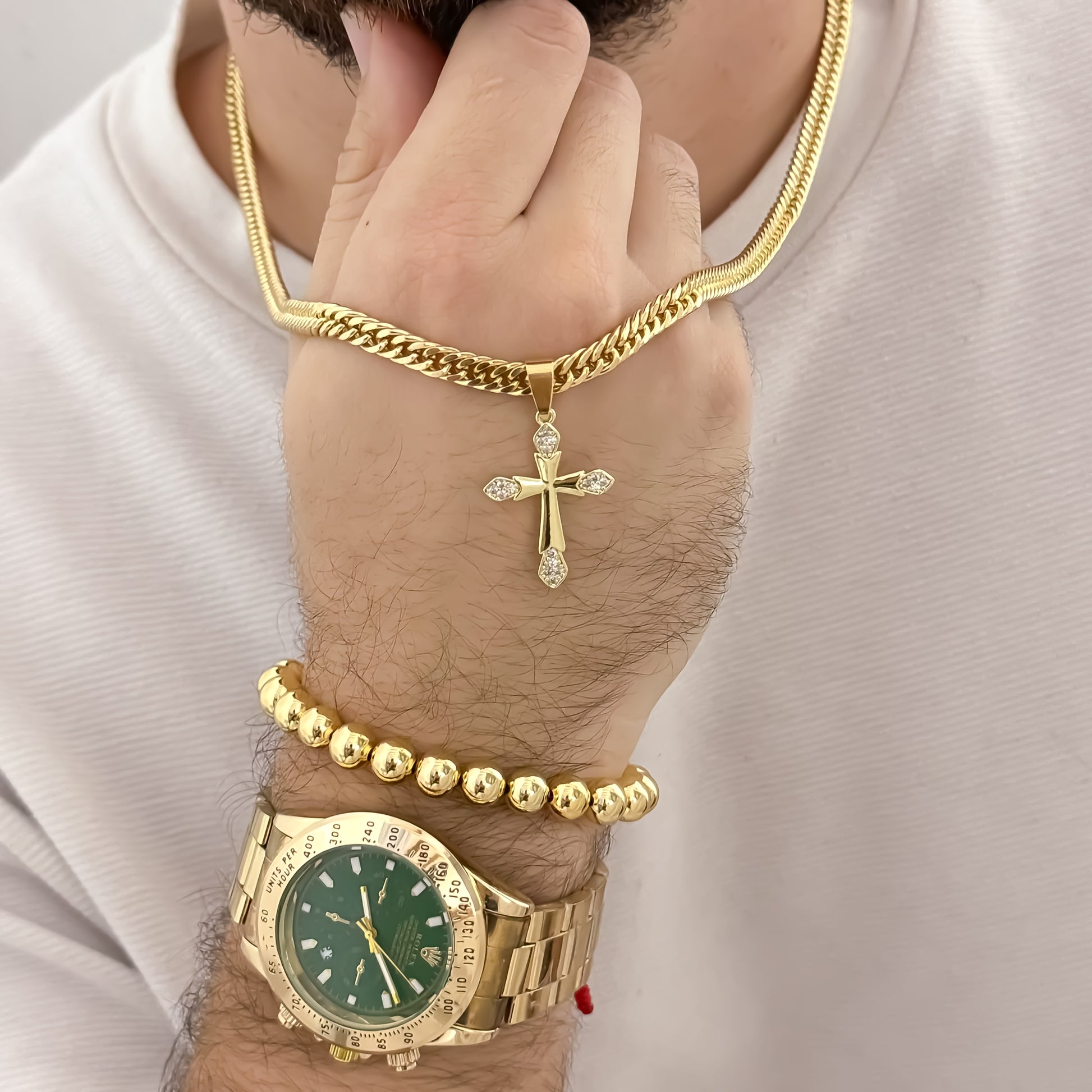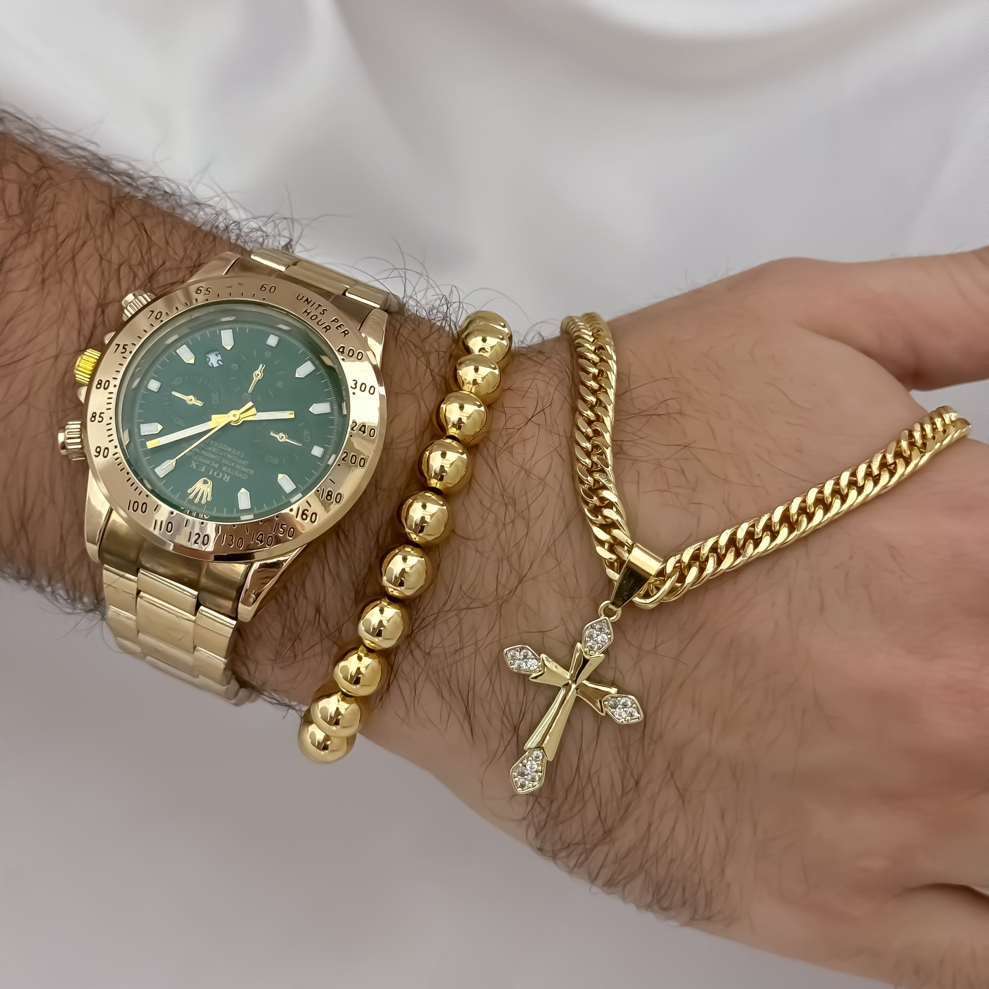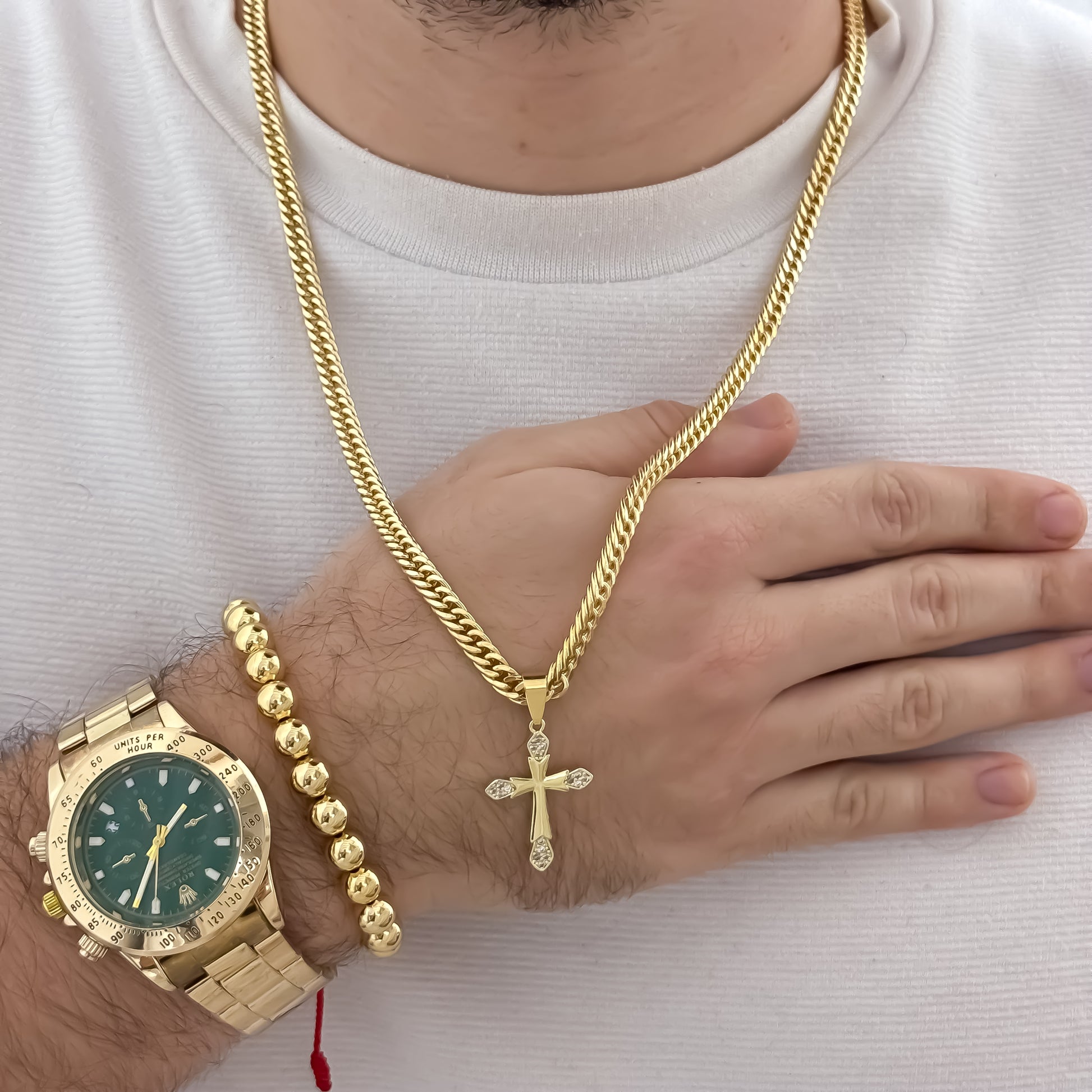 Cadena Cubana Cruzada de 60cm de 3mm de Grosor + Cruz trébol con micro circones + Pulsera Balin de 8mm en Oro Laminado 18k con Reloj Rolex de Alta Calidad