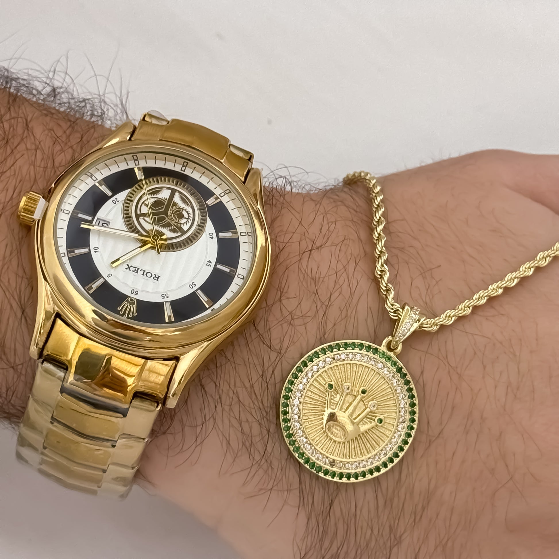 Cadena Lazo de Hombre de 60cm de 3mm de Grosor + Dije de Corona Rolex con micro circones en Oro Laminado 18k + Reloj Rolex de Alta calidad con Garantía