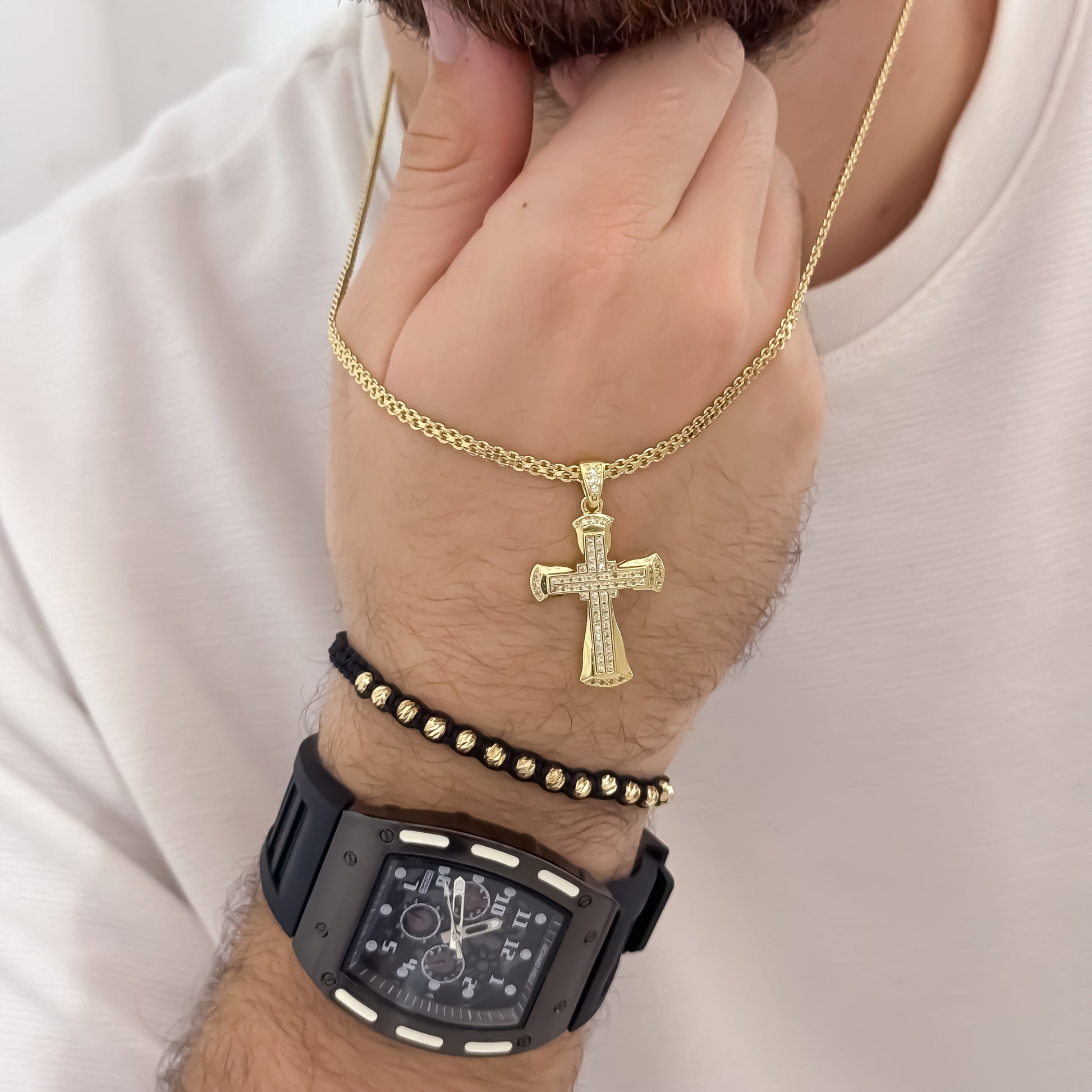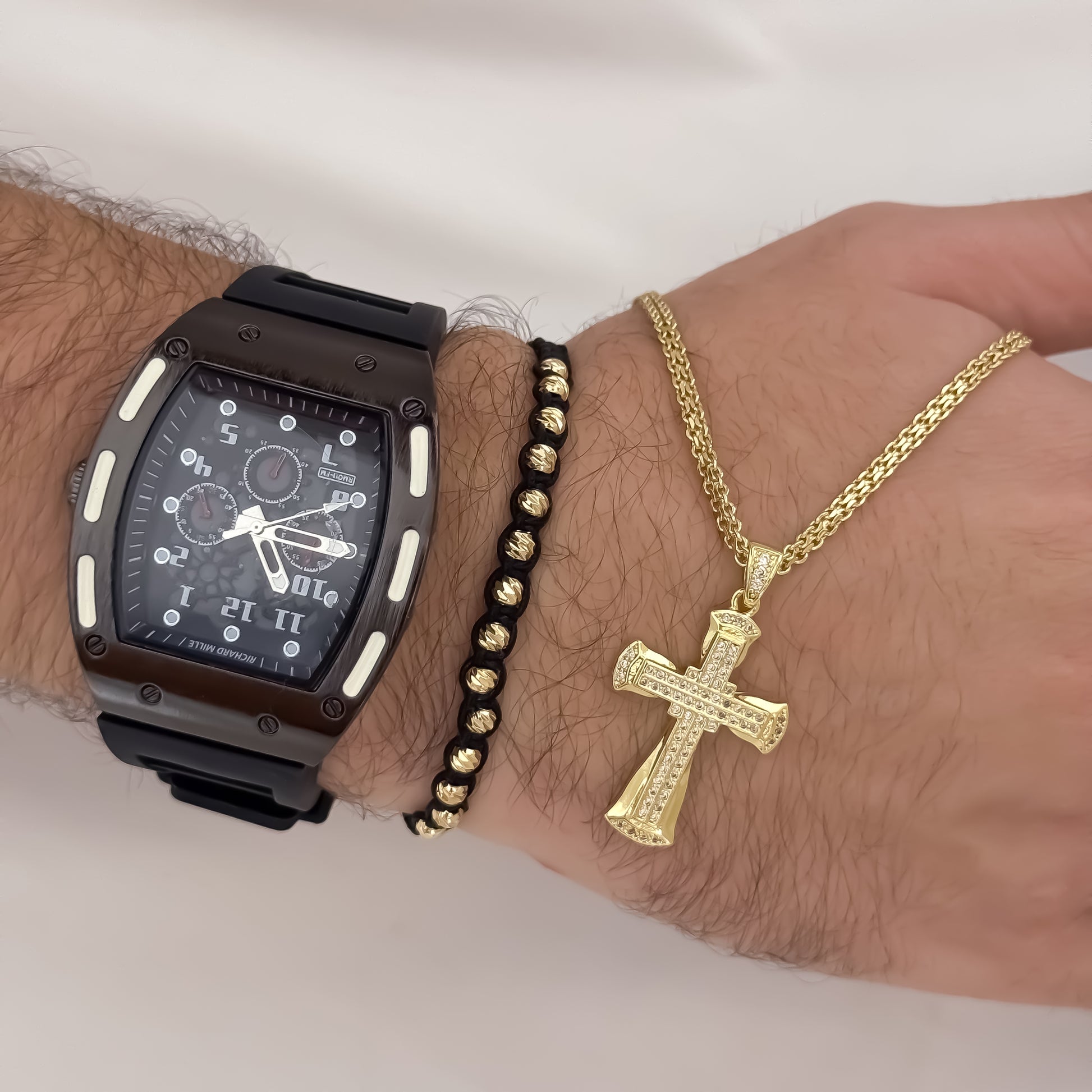 Cadena Tejido Chino de Hombre de 60cm de 3mm de Grosor + Cruz Lisa con Micro circones + Pulsera Balin italiano de 4mm en Oro Laminado 18k con Garantía de por vida + Reloj Richard