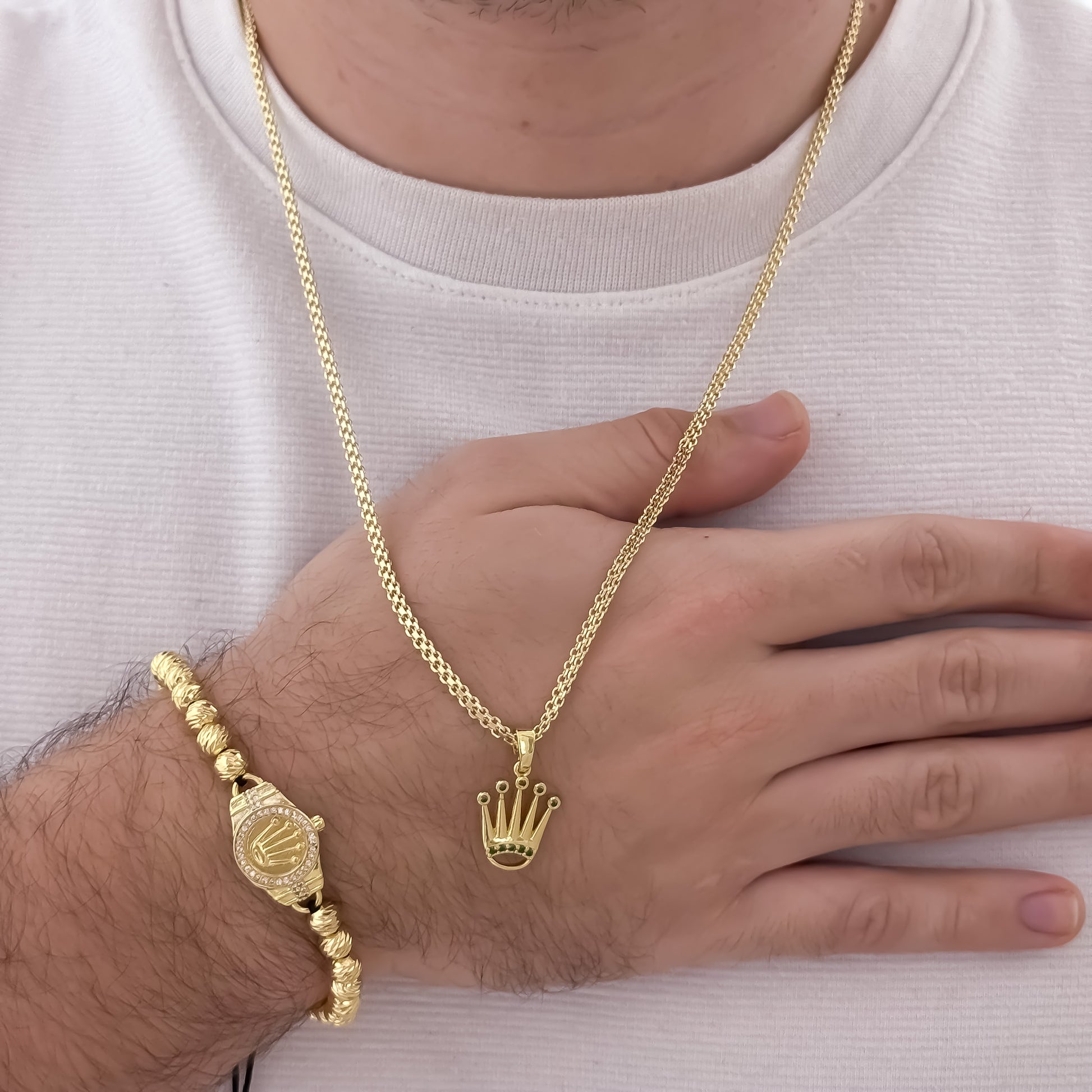 Cadena Tejido chino de 60 cm y 3 mm de grosor: Fuerte, imponente y con un diseño masculino atemporal. Dije Corona Rolex con micro circones incrustados: Detalles brillantes que elevan el estilo y representan liderazgo, éxito y poder. Pulsera Balín Italiano de 8 mm con Corona Rolex: Complemento ideal que une lujo y sofisticación, diseñada para destacar en cualquier ocasión.
