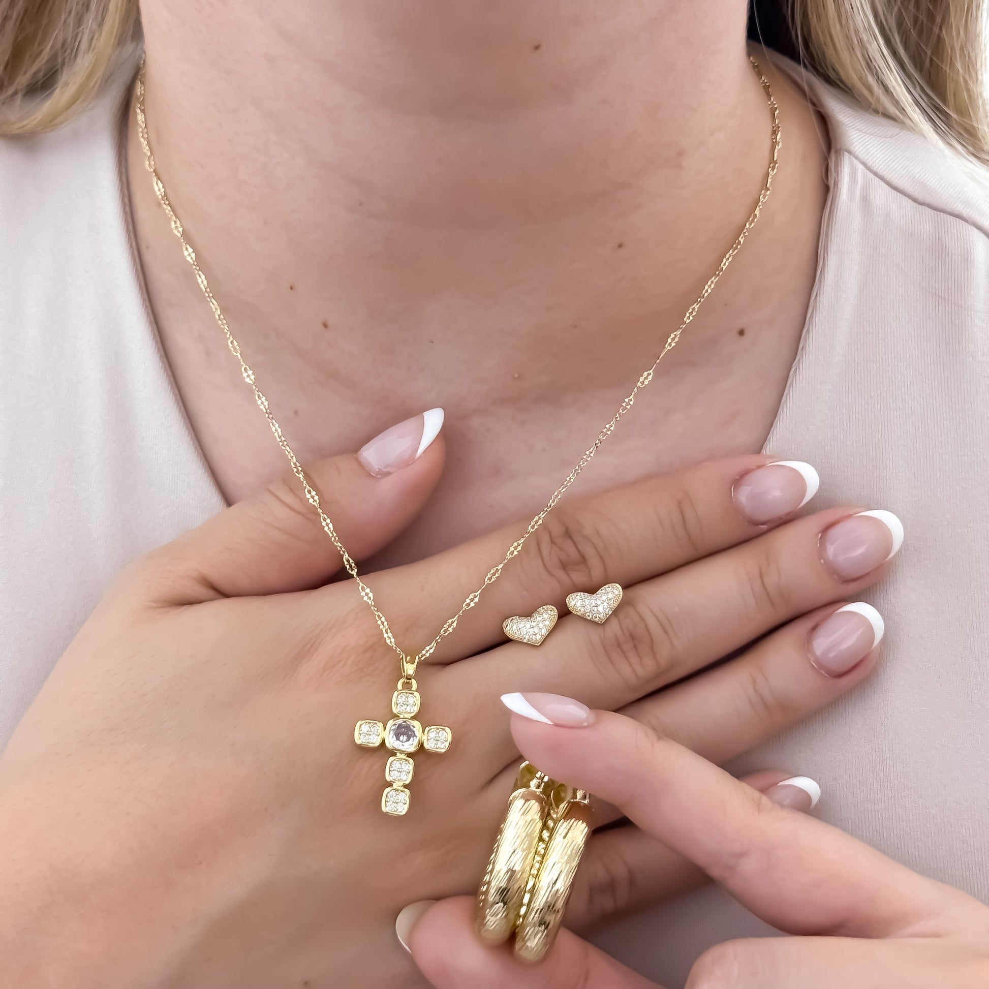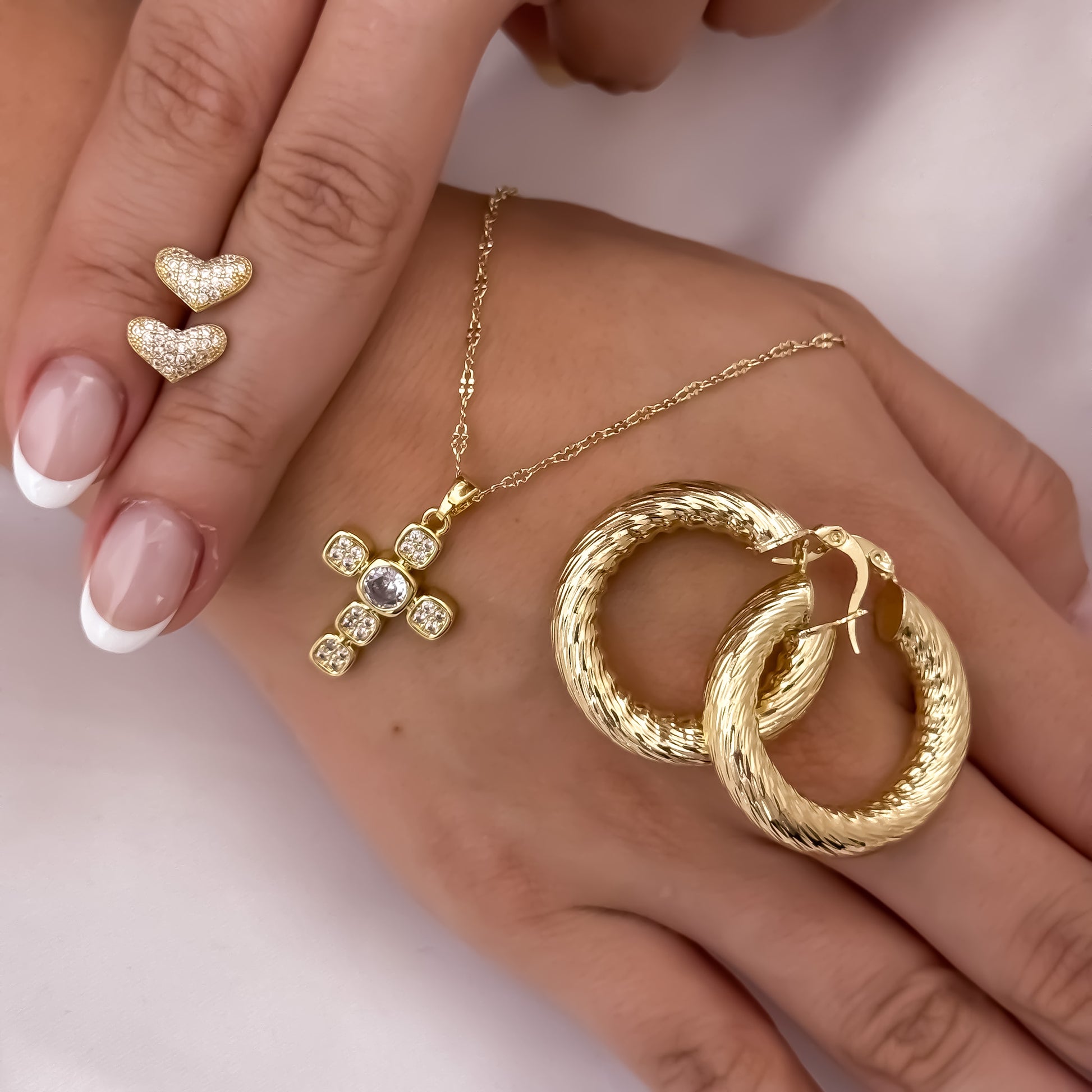 Cadena Tejido Crispeta de Dama de 45cm + Cruz con Micro Circones + Topos Corazon + Candongas Tubular en Oro Laminado 18k con Garantia de por vida