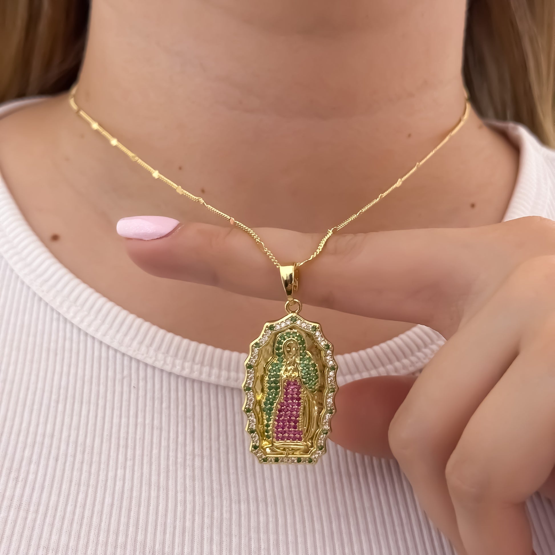Material: Oro Laminado 18K Premium (8 capas reales) Cadena: Cubana delgada, elegante y resistente Dije: Virgen de Guadalupe tallada con micro circones de colores Pulsera: Balín italiano 6 mm en 3 oros + dije mini cruz Cierre: Seguro y duradero Acabado: Brillo espejo, alta joyería