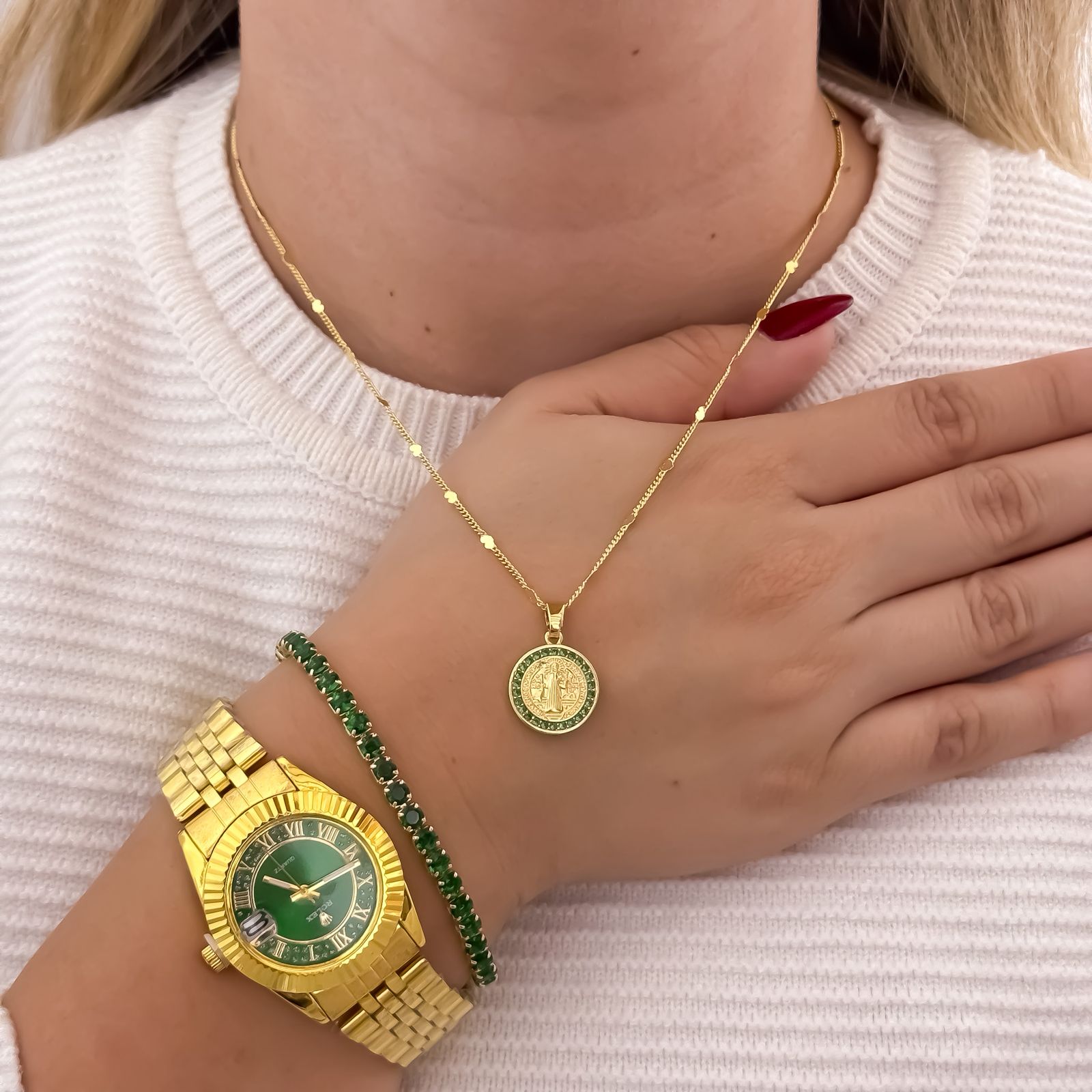 Cadena Tejido Cubana de Dama de 45cm + San Benito Protección con Micro Circones Verde Esmeralda + Pulsera Tennis Verde Esmera + Reloj en Oro Laminado 18k con Garantia de por vida