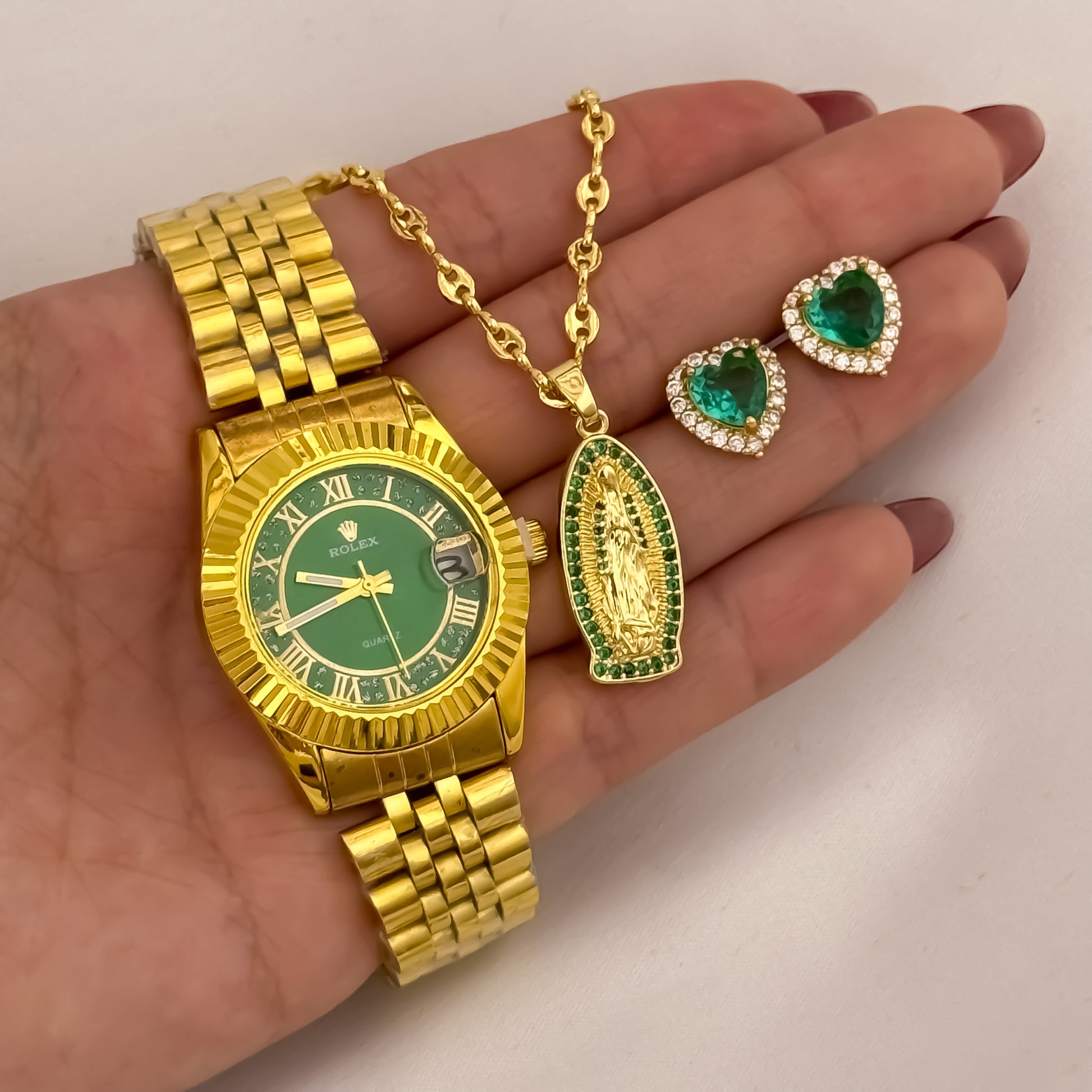 Conjunto Dama Oro Laminado 18K — Cadena Tejido Gucci 45cm + Dije Virgen de Guadalupe con Micro Circones Verde Esmeralda + Topos Verde + Reloj Rolex Dama
