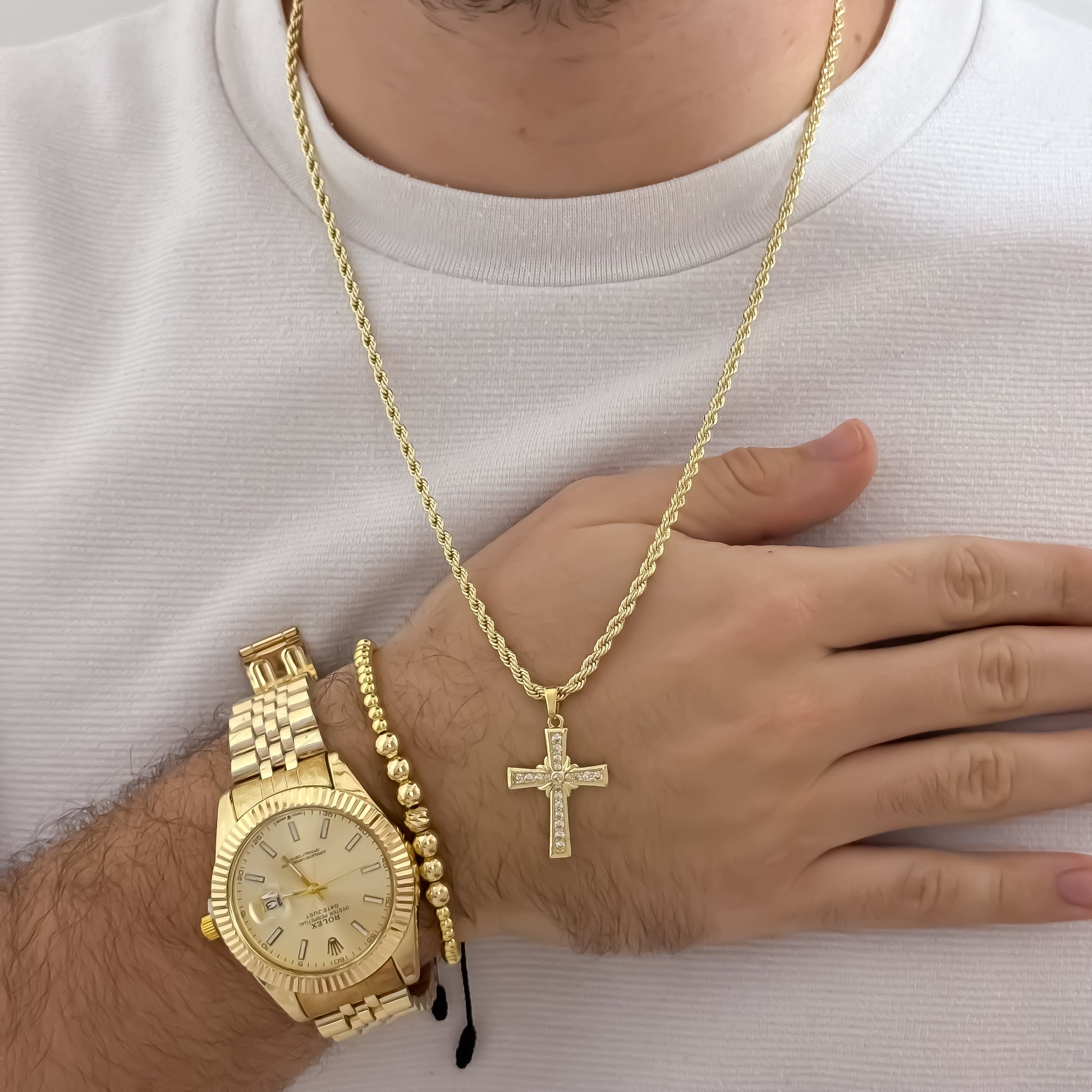 Cadena Tejido Lazo Siciliano de 60cm de 3mm de Grosor + Cruz con Micro circones cristales + Pulsera Full Balines Liso de 5mm 6mm + Reloj Rolex de Caballero