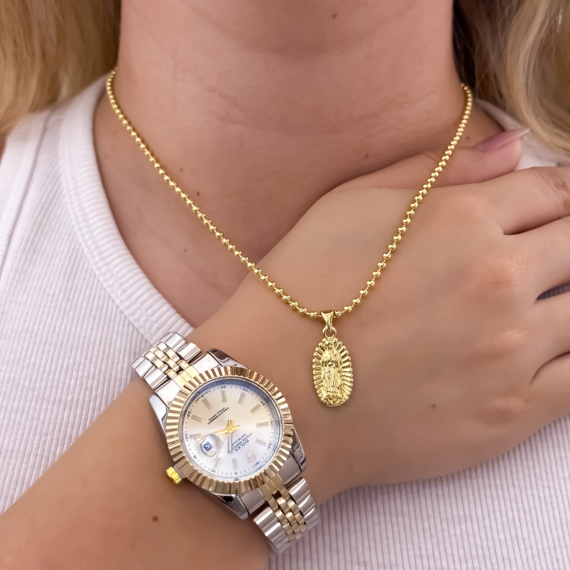 Conjunto de Alta Joyería para Dama – Elegancia, Fe y Lujo Accesible Cadena de 45cm tejido militar de 3mm + Dije Virgen de Guadalupe tallada + Reloj Dama bicolor tipo Rolex