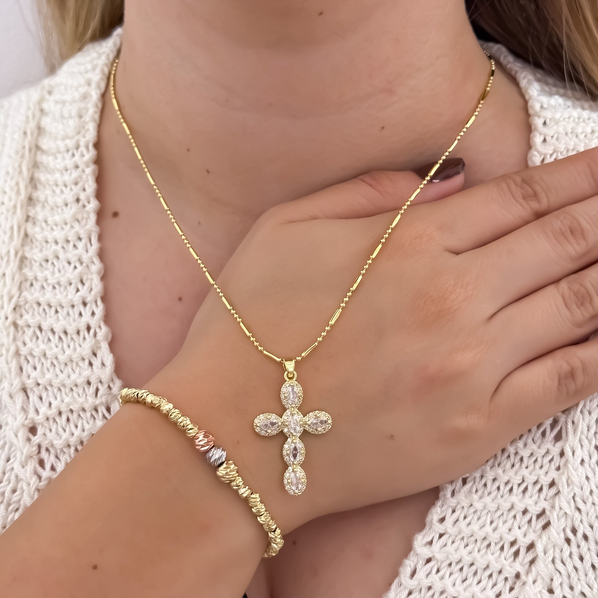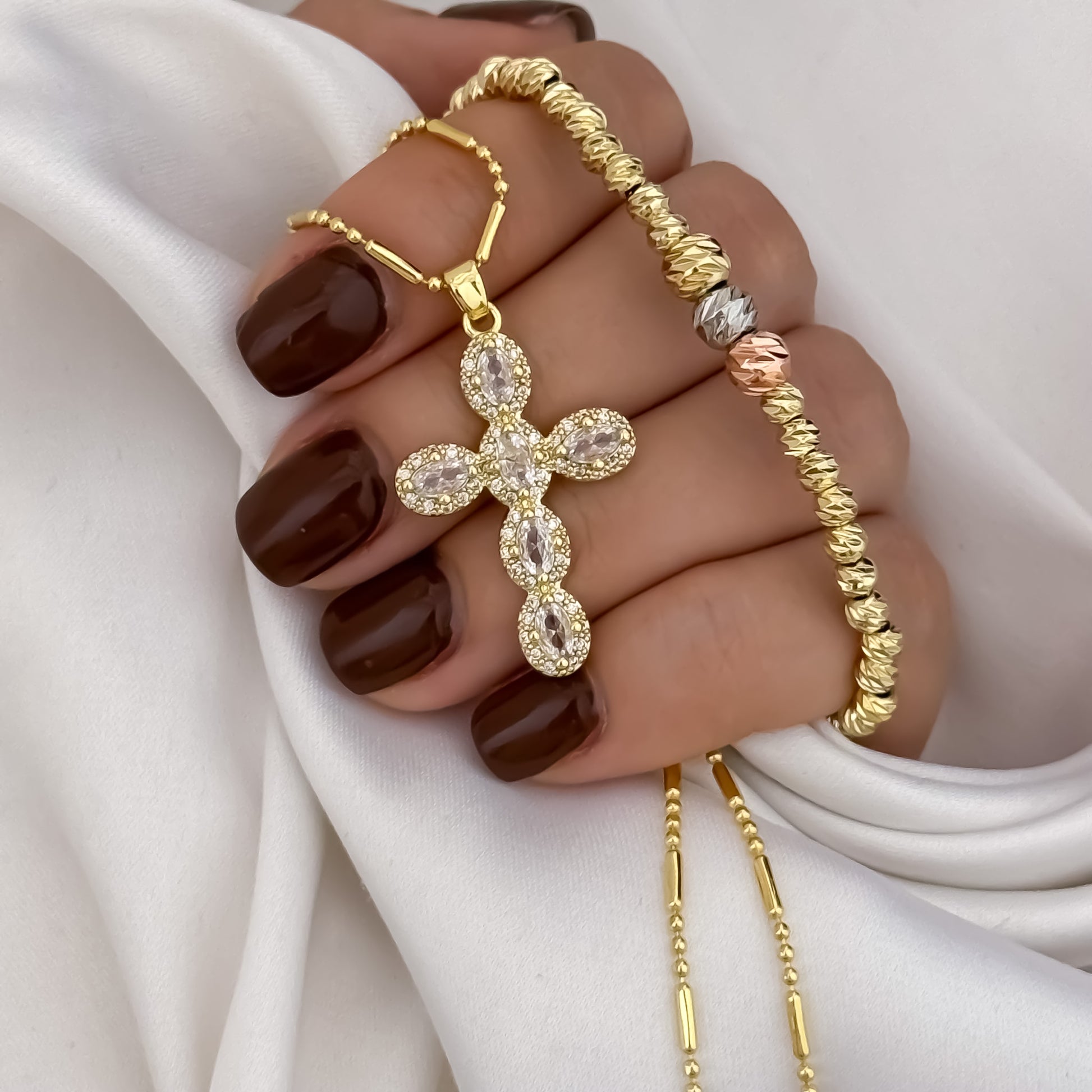 Este elegante set de dama incluye una cadena de tejido Militar Palillo una hermosa cruz con micro circones cristales, pulseras balín italiano de 5mm , todo cuidadosamente elaborado en oro laminado 18K.