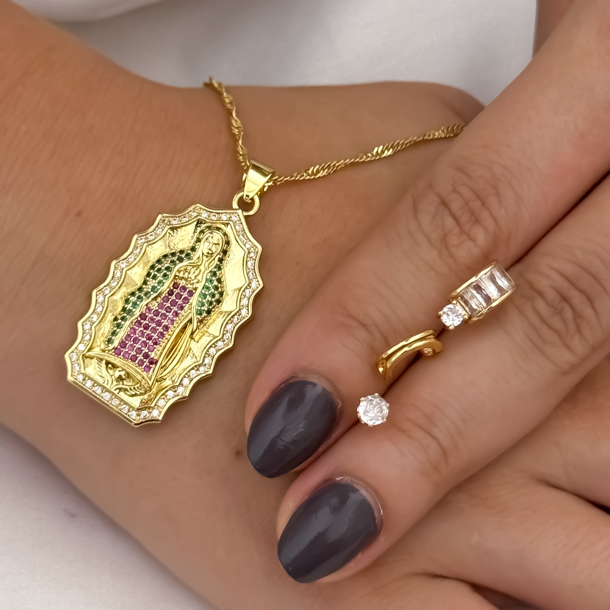 Este exclusivo Conjunto de la Virgen de Guadalupe combina devoción, estilo y protección en tres piezas esenciales: una hermosa cadena con dije de la Virgen de Guadalupe, un anillo con detalles tallados de colores y la promesa de acompañarte siempre con su luz y guía.