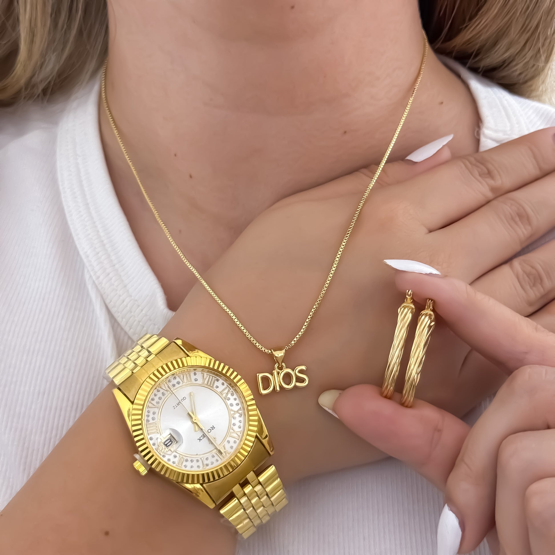 Cadena Tejido Veneciano + Dije de Dios + Candongas melcochas en Oro Laminado 18k con Garantia de por vida + Reloj Rolex de Dama con Garantia