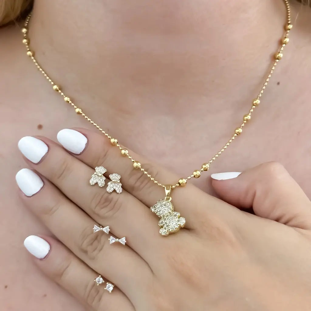 Realza Tu Estilo con un Toque de Elegancia Un conjunto exclusivo de joyería en baño de oro de 18k: cadena de lazo, pulsera y un encantador oso teddy. Perfecto para brillar en cada ocasión.