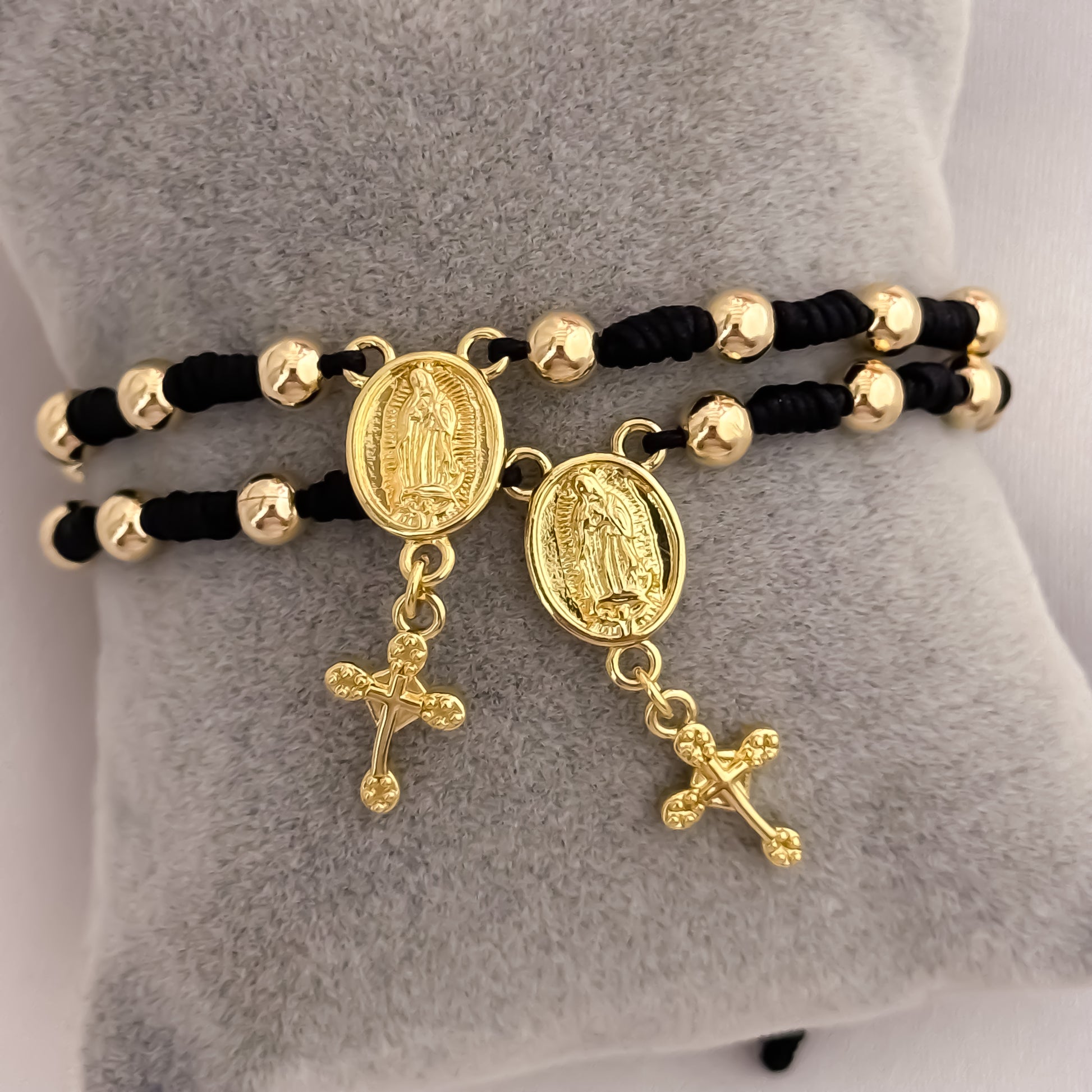 Son dos denarios tejidos con hilo negro premium, intercalados con balines de oro laminado 18K, acompañados de: Medalla de la Virgen Milagrosa → símbolo de protección y bendiciones. Cruz protectora → representa fe y fortaleza espiritual. Tejido macramé ajustable → se adapta perfectamente a cualquier muñeca.