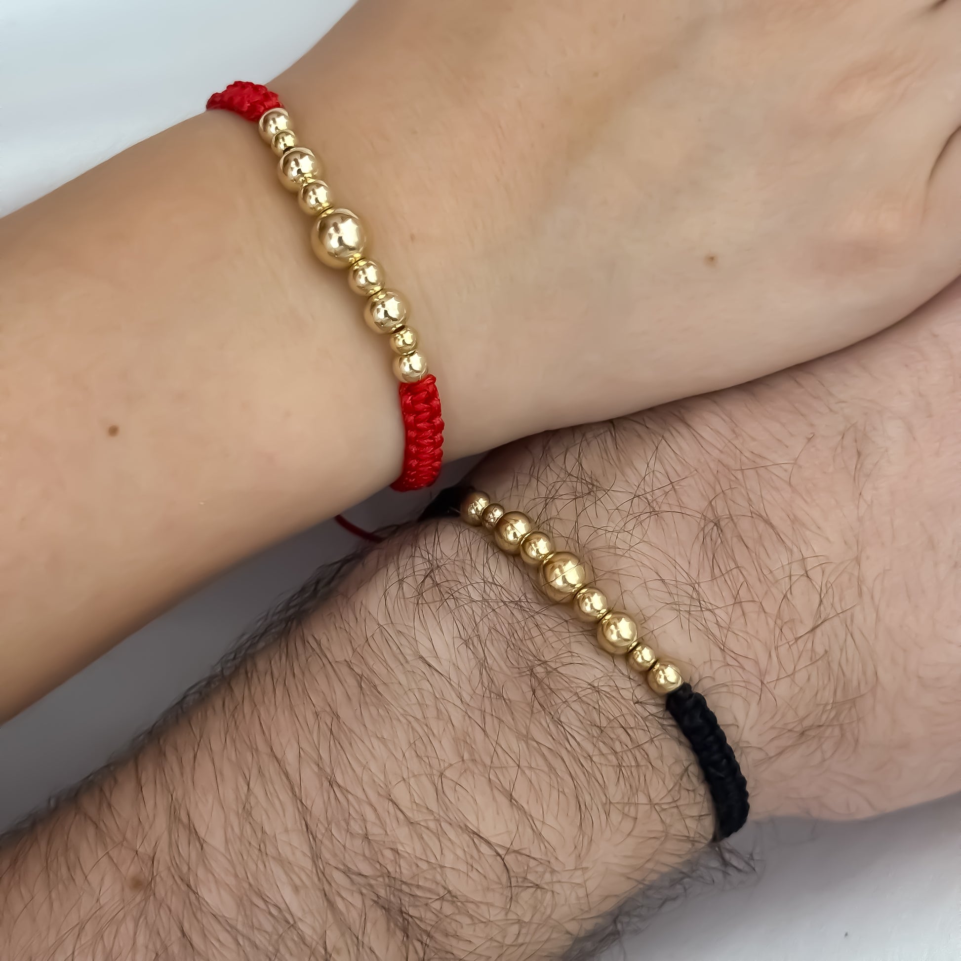 Las pulseras de hilo rojo y negro han sido utilizadas durante siglos en diversas culturas como amuletos de protección y compromiso. Cuando una pareja las usa, simbolizan: